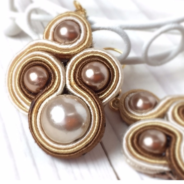 大小のパールをベージュ系のソウタシエコードで流線型に囲んで上品に仕上げました。 主な素材がソウタシエコードとビーズやスワロフスキーのため作品自体がとても軽く、大振りで華やかなデザインにもかかわらず、気軽に身に着けられるのが特徴です。 【サイズ】 大きさ 2.8㎝×3.3㎝ 重さ 3g(片耳) ☆イヤリングに変更可能 【素材】 ソウタシエ(soutache)コード、チェコガラスパール、レザー生地(裏面)
