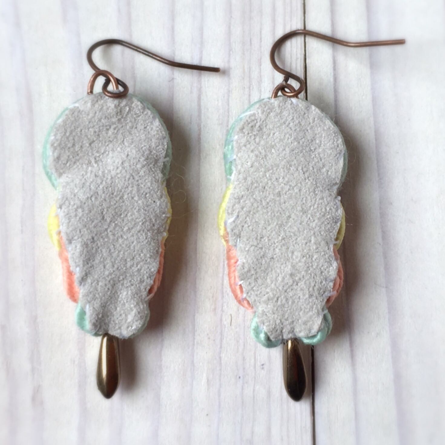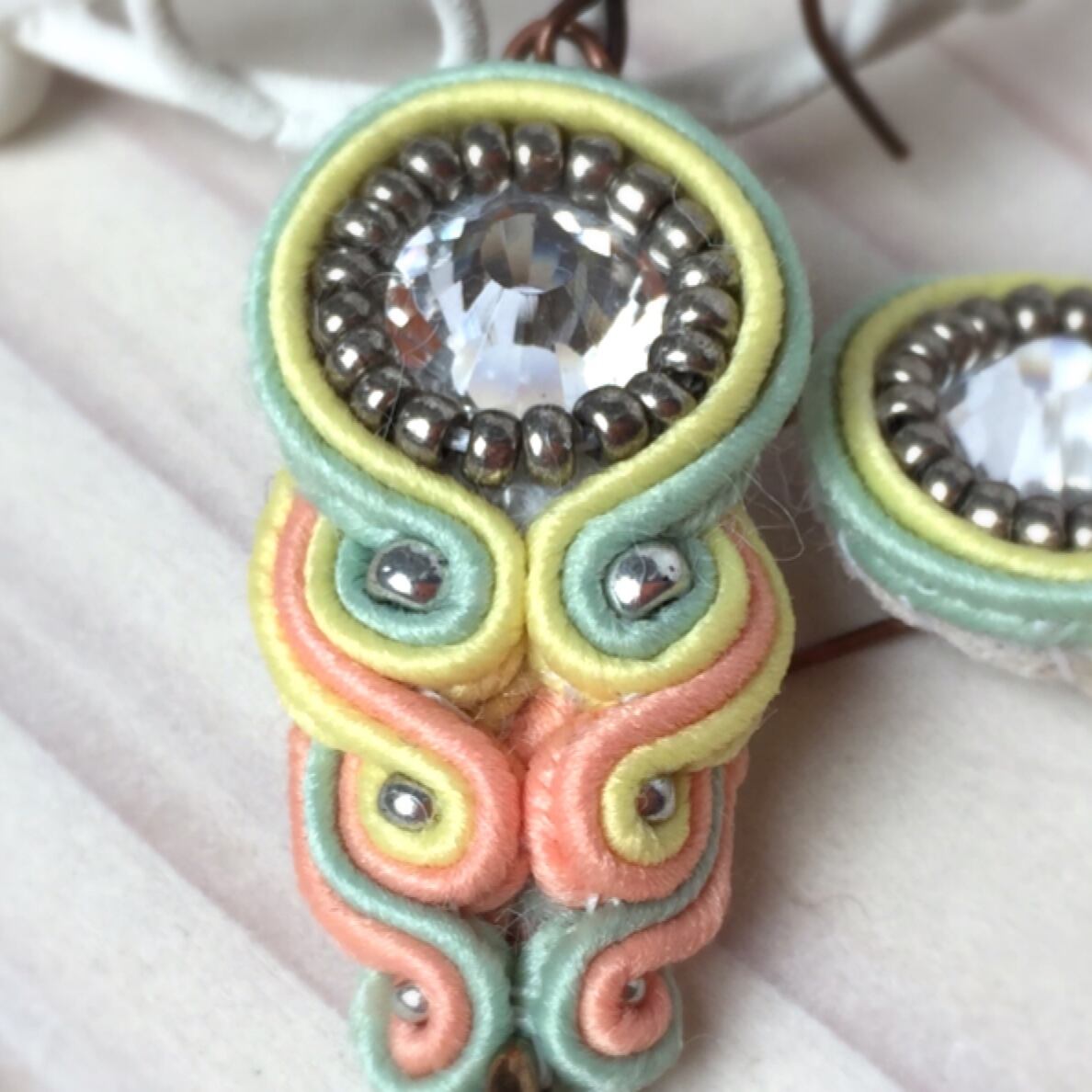パステルカラーのソウタシエコードを流線型に縫い、個性的でかわいらしアクセサリーになるように仕上げました。