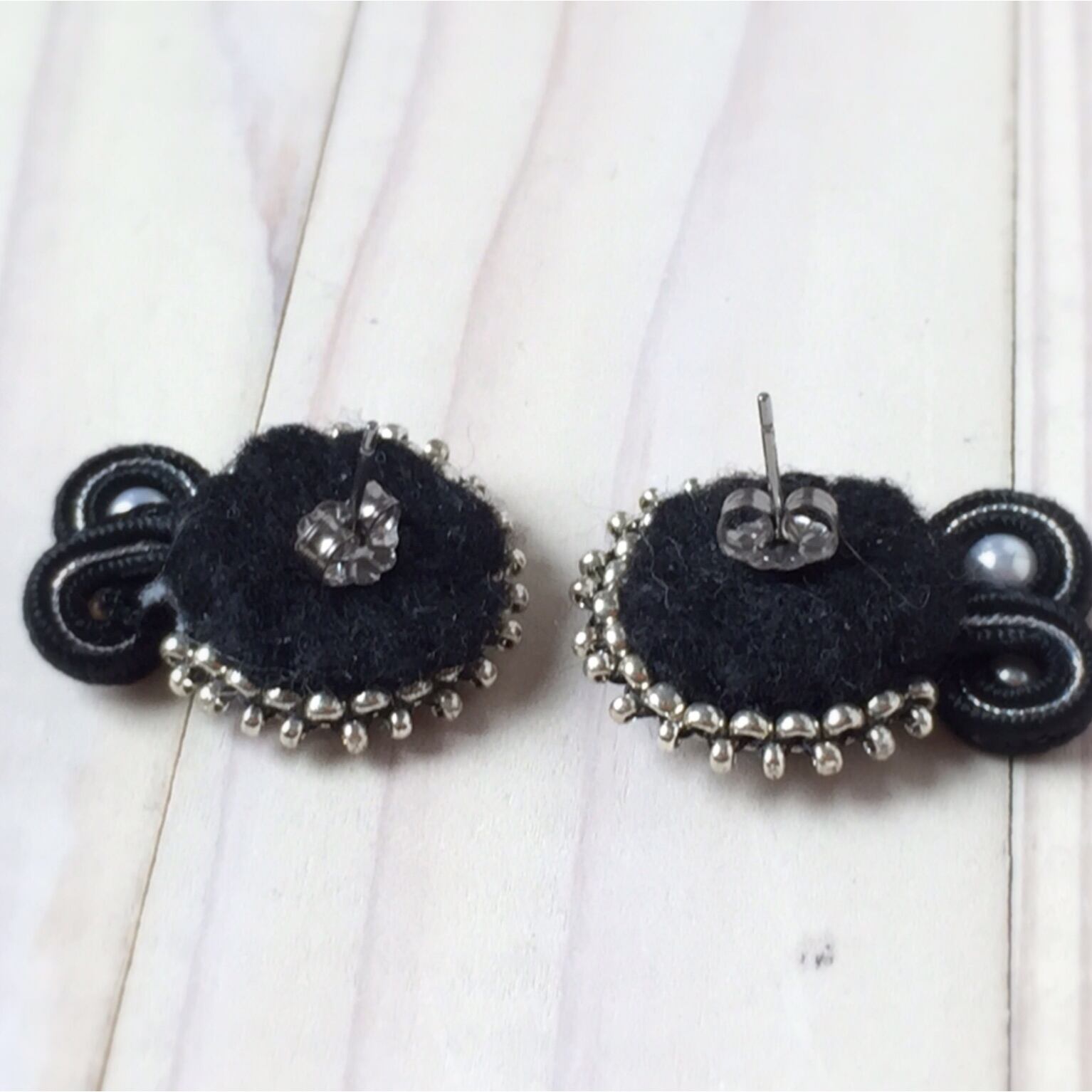 ブラックとシルバーのクラシックな色合いのソウタシエコードを使い、普段でもフォーマルでも使いやすいピアスに仕上げました。