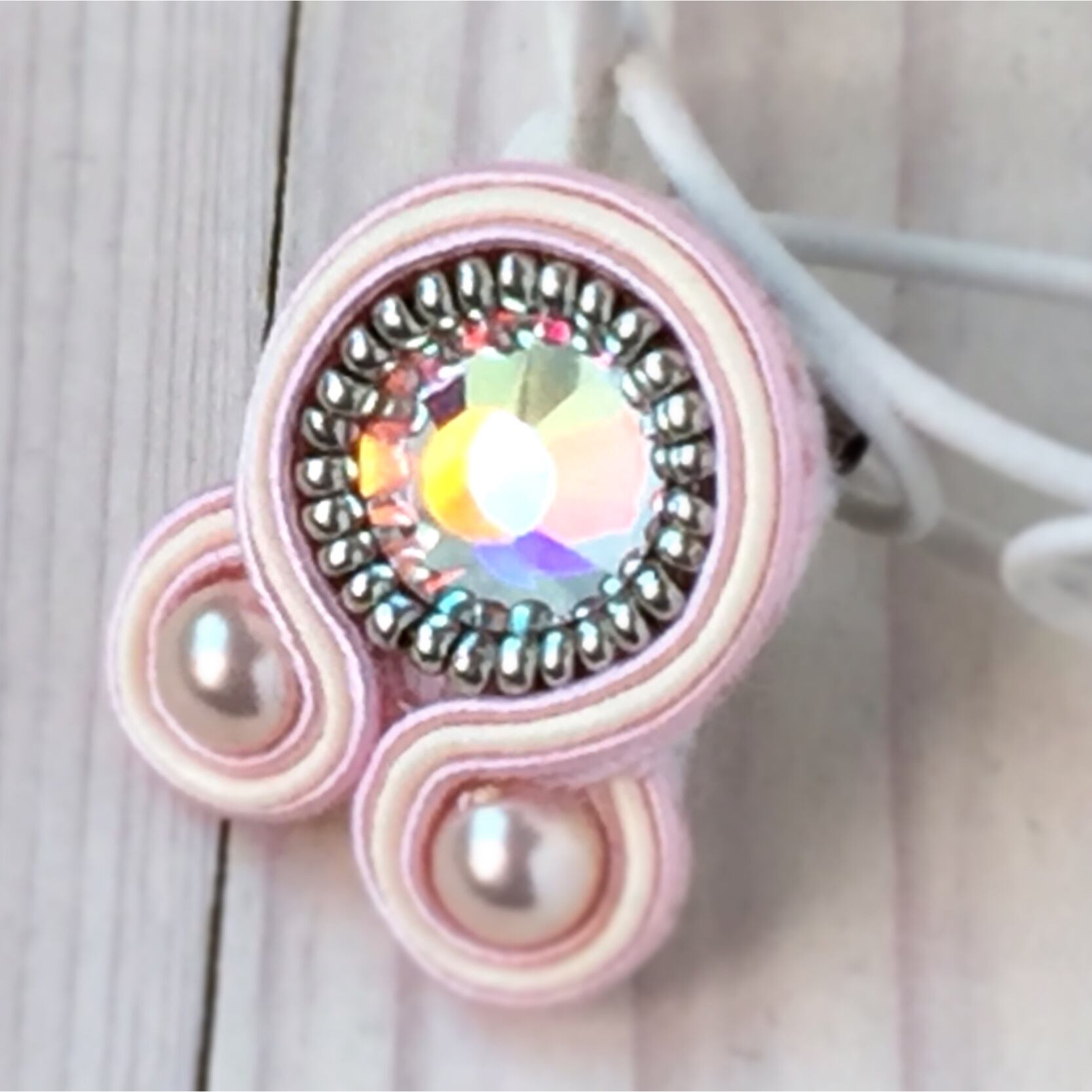 スワロフスキーより歴史の古い高級クリスタルメーカーであるプレシオサのラインストーンをソウタシエコードで囲み、カジュアルにも着けられるキラキラと美しいブローチになるように仕上げました。